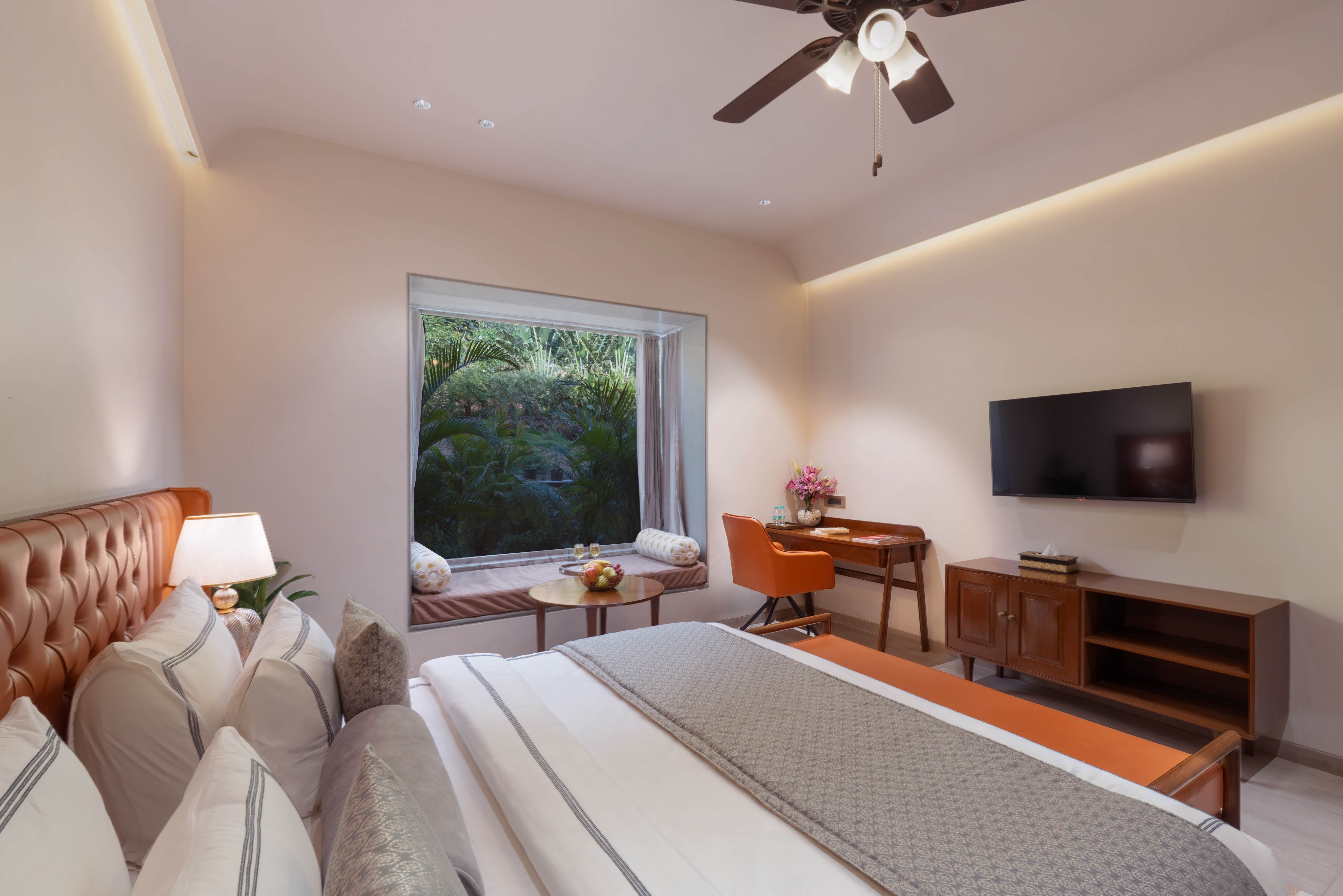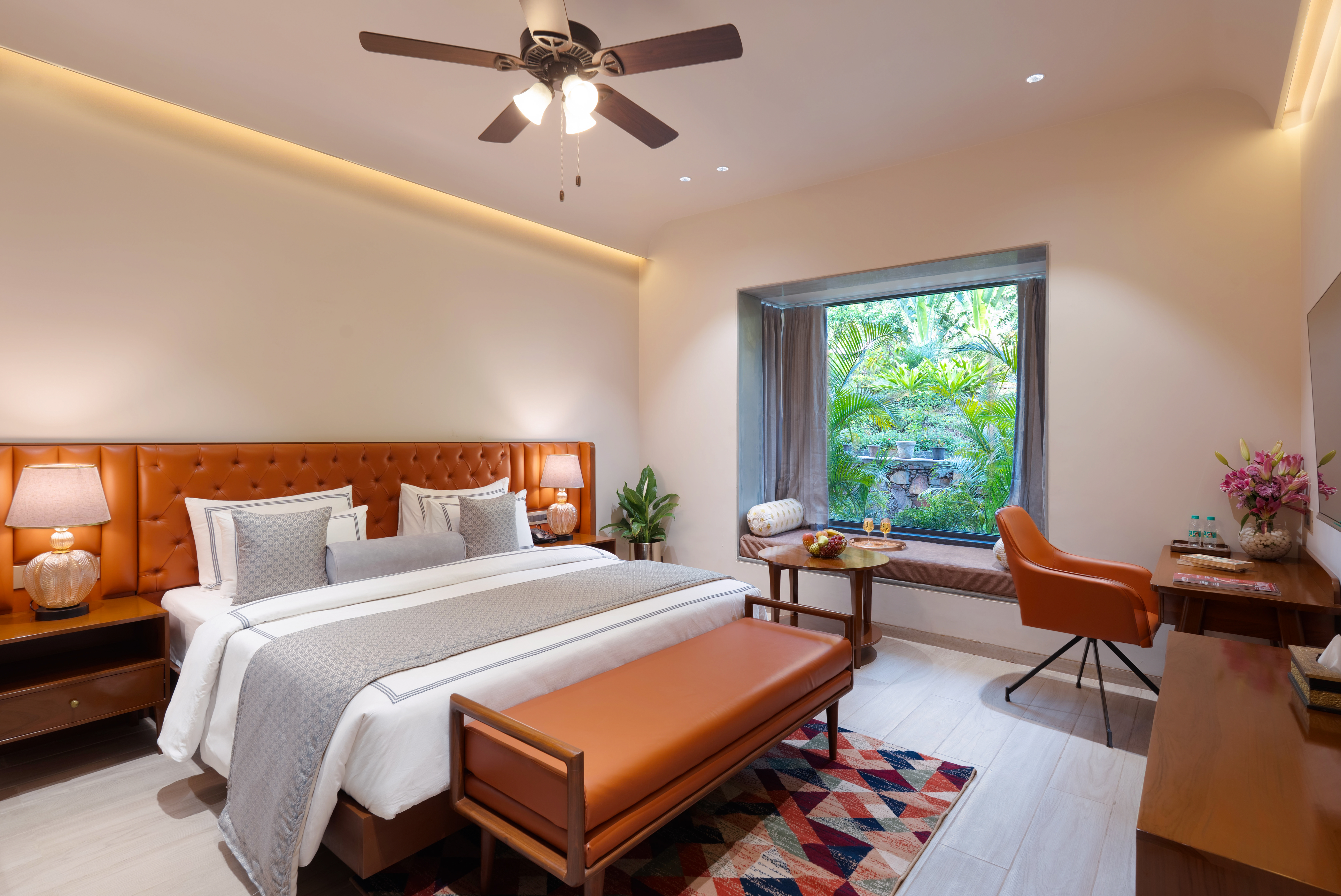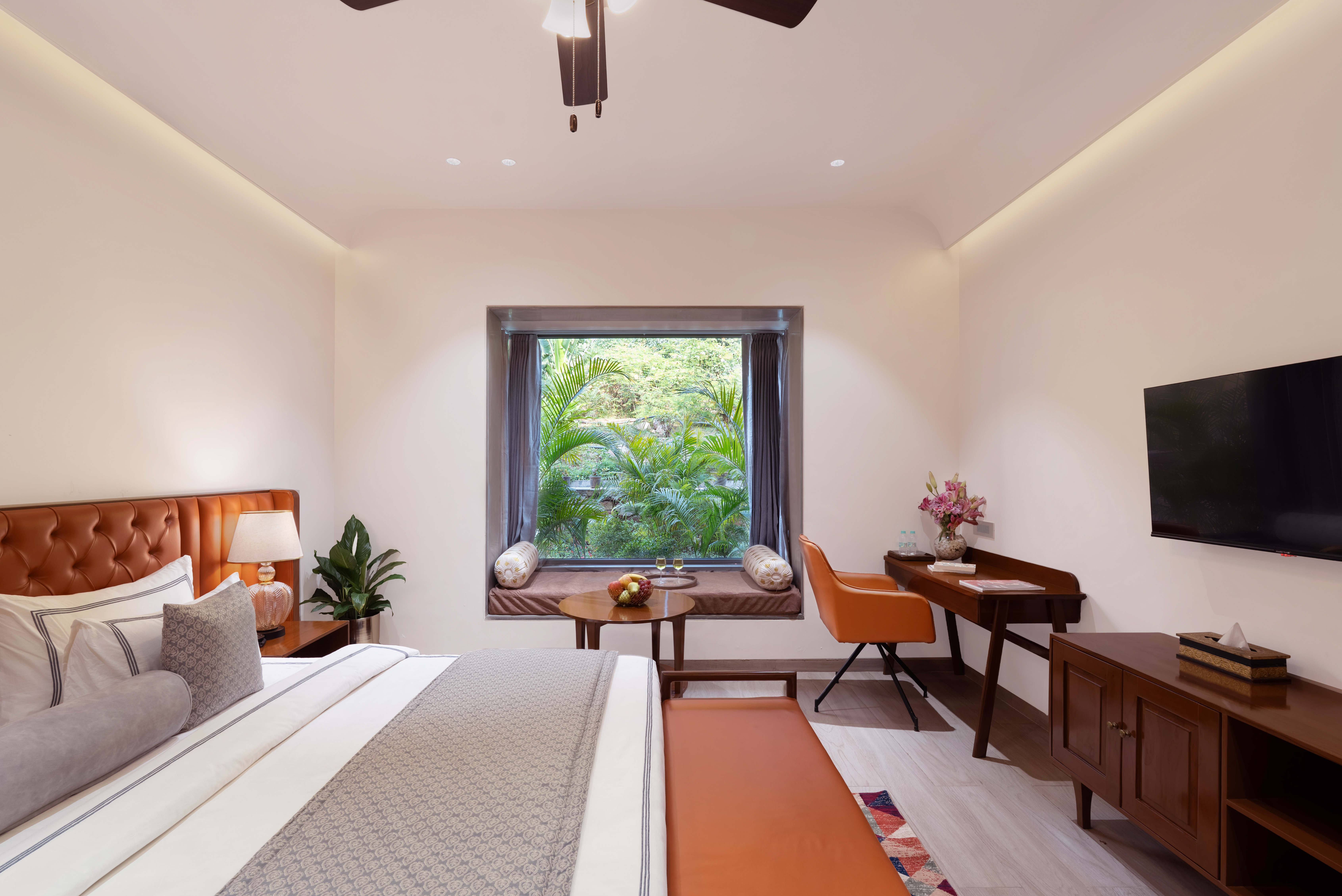 If you’re looking for a stay that instantly puts you at ease, the Mountain View Room in Udaipur at Traavista Rivera does exactly that. The room opens to the Aravali hills, giving you a clear, calming view that sets the tone for your entire trip. Our mountain view room in Udaipur is built around two things: a genuine, uninterrupted mountain backdrop and a warm, modern interior that feels easy to settle into. Natural light, a private balcony, and quiet, elegant décor make it a space you’ll look forward to returning to every day. It’s ideal for couples, families, and solo travellers who want a scenic, comfortable stay that genuinely feels refreshing.